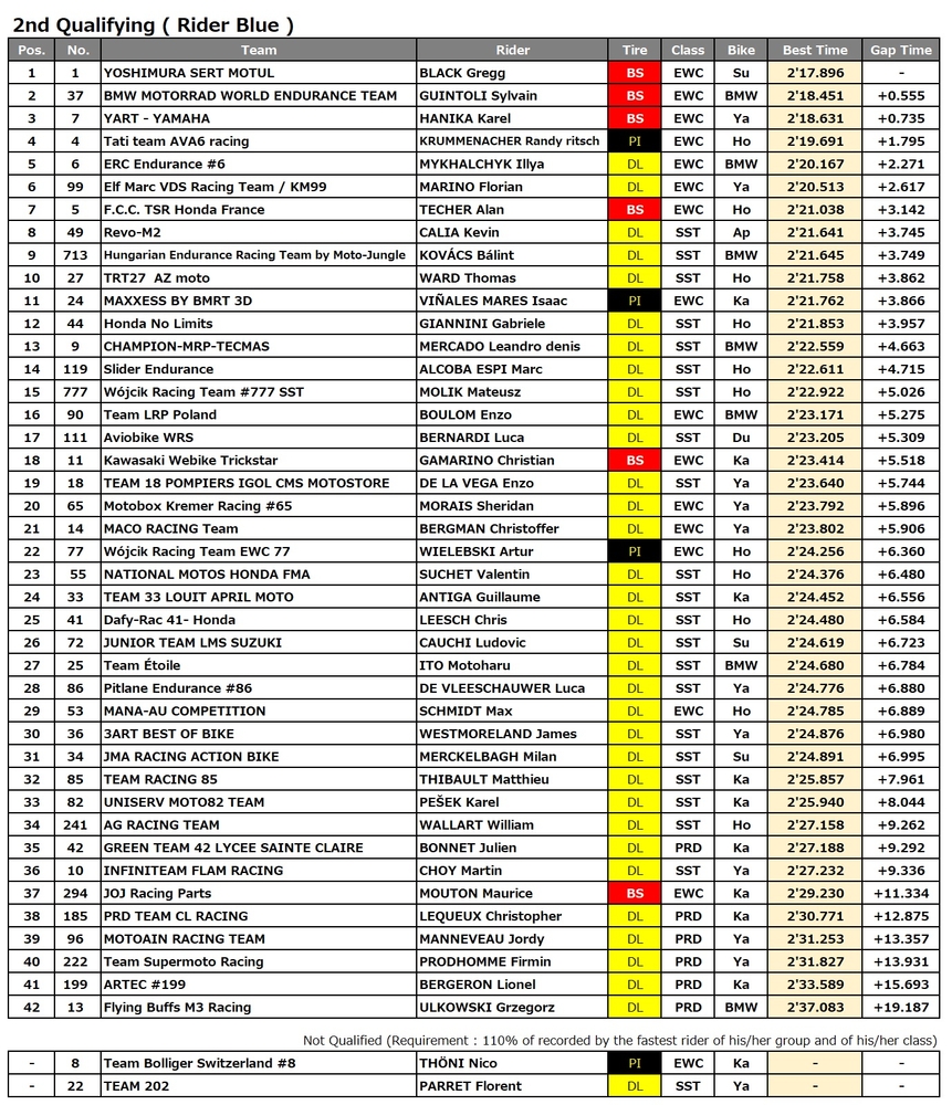予選2回目が終わり、各ライダー最速記録の上位2つを2で割った総合結果は、グレッグ・ブラックが2分17秒896でコースレコードを更新した#1 Yoshimuraがトップ。僅か0.011秒差で2番手に#7 YARTが入り、3番手は#37 BMW。4番手の#5 TSRまで2分18秒台の僅差で並び、トップ4をBS勢が独占した。#11 KWTは9番手から決勝レースをスタートする。スパウェザーと呼ばれる予測不能な天候も想定され、決勝に向けて楽しみな予選が繰り広げられた。