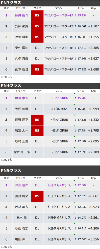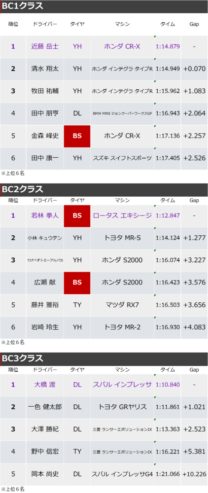 速報 2026.03.08 4輪 全日本ジムカーナ選手権 速報 前の速報 次の速報 2026.03.08 13:00【速報】2026年全日本ジムカーナ選手権 第1戦 筑波サーキットコース1000 決勝第1ヒート結果 2026年全日本ジムカーナ選手権 第1戦 筑波サーキットコース1000 決勝第1ヒート結果速報天候/路面:晴れ/ドライこのあとから始まる2本目もブリヂストン装着車両の応援をお願いいたします!!【第1ヒート結果】 この記事をシェアする ※ 外部サイト、外部アプリケーションが起動します。 前の速報 次の速報