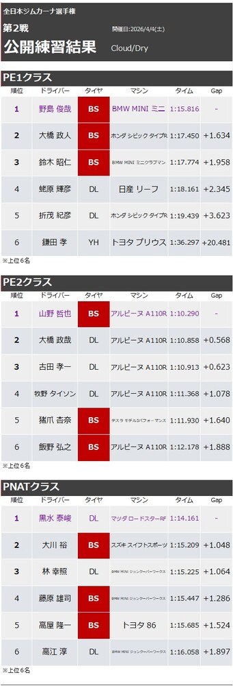 速報 2026.04.04 4輪 全日本ジムカーナ選手権 速報 前の速報 次の速報 2026.04.04 15:15【速報】2026年全日本ジムカーナ選手権 第2戦 スピードパーク新潟 公開練習結果 公開練習の走行が終了しました。▼結果▼【コンディション】天候:くもり一時小雨路面:ドライ【結果】 明日の決勝も引き続き速報します。 この記事をシェアする ※ 外部サイト、外部アプリケーションが起動します。 前の速報 次の速報