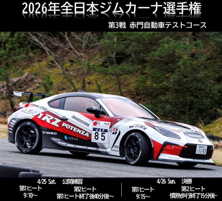 速報 2026.04.25 4輪 全日本ジムカーナ選手権 速報 前の速報 次の速報 2026.04.25 10:002026年全日本ジムカーナ選手権 第3戦 赤門自動車テストコース 公開練習日[コース図紹介] 現地(10:00時点)は気温14℃で晴れ/ドライです。第3戦 赤門自動車テストコースのスケジュールと公開練習のコース図をご紹介いたします。随時結果を速報します!!引き続きよろしくお願いします。【スケジュール】【公開練習コース図】【現地】【ランキング】こちらからブリヂストン装着ドライバー・チームの応援よろしくお願いします! この記事をシェアする ※ 外部サイト、外部アプリケーションが起動します。 前の速報 次の速報