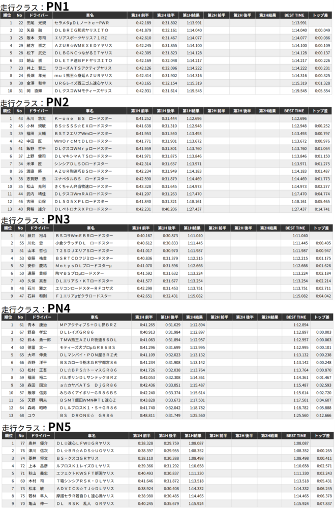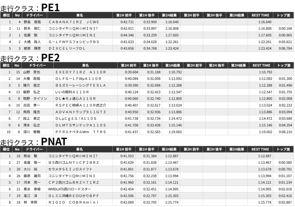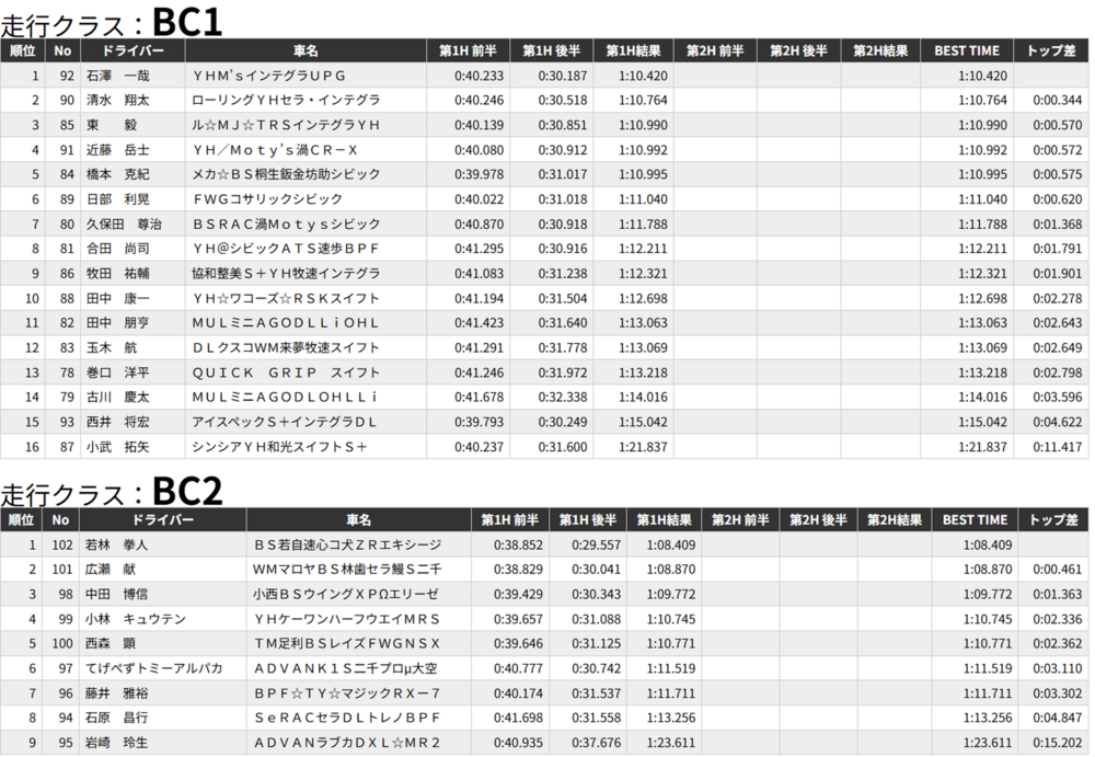 速報 2026.04.26 4輪 全日本ジムカーナ選手権 速報 前の速報 次の速報 2026.04.26 12:04【速報】2026年全日本ジムカーナ選手権 第3戦 赤門自動車テストコース 決勝第1ヒート結果 決勝第1ヒート結果速報 天候/路面:晴れ/ドライこのあとから始まる第2ヒートもブリヂストン装着車両の応援をお願いいたします!! 【第1ヒート結果】 BC3クラスは不成立 この記事をシェアする ※ 外部サイト、外部アプリケーションが起動します。 前の速報 次の速報