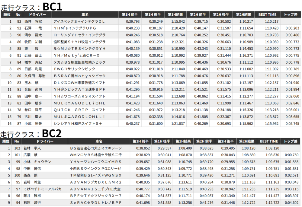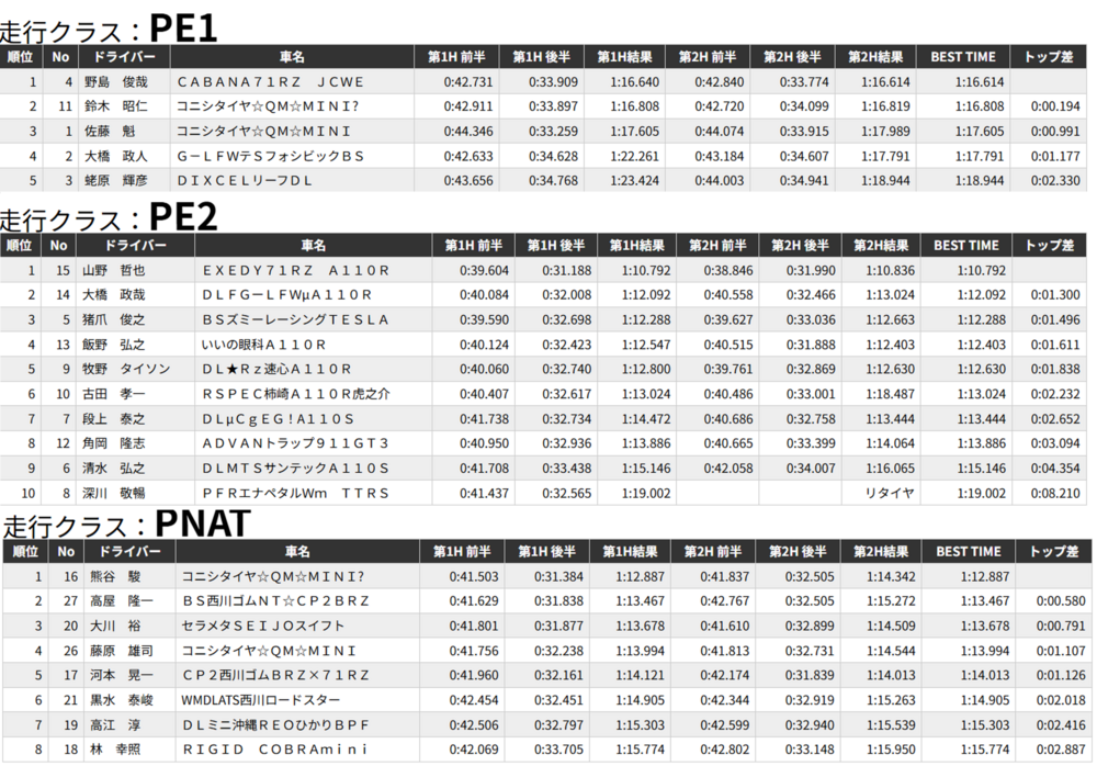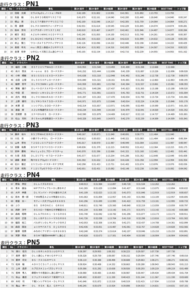 速報 2026.04.26 4輪 全日本ジムカーナ選手権 速報 前の速報 2026.04.26 16:02【速報】2026年全日本ジムカーナ選手権 第3戦 赤門自動車テストコース 決勝結果 全10クラス中6クラスで優勝!! 決勝結果天候/路面:晴れ/ドライPE1:野島、PE2:山野、PNAT:熊谷PN2:福田、PN3:藤井BC2:若林が優勝!!応援ありがとうございました!!【決勝暫定結果】【ギャラリー】 この記事をシェアする ※ 外部サイト、外部アプリケーションが起動します。 前の速報