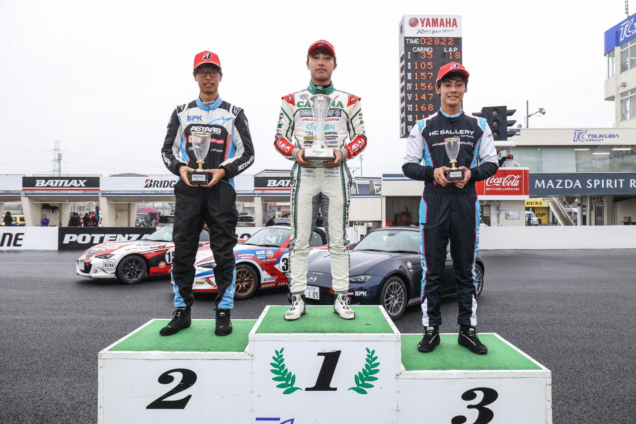 レースの折り返しを迎えるころになると雨脚が強くなり始め、石塚と橋本の3番手争いがヒートアップ。橋本が11周目のバックストレートからプレッシャーを掛け、12周目の第2ヘアピンで3番手に浮上した。ここから終盤になると再び雨量が増えたために、レースは少し落ち着いた展開となった。整理すると、ポールポジションから逃げ切った佐々木がジャパンツアーシリーズでの初優勝を達成。![]()