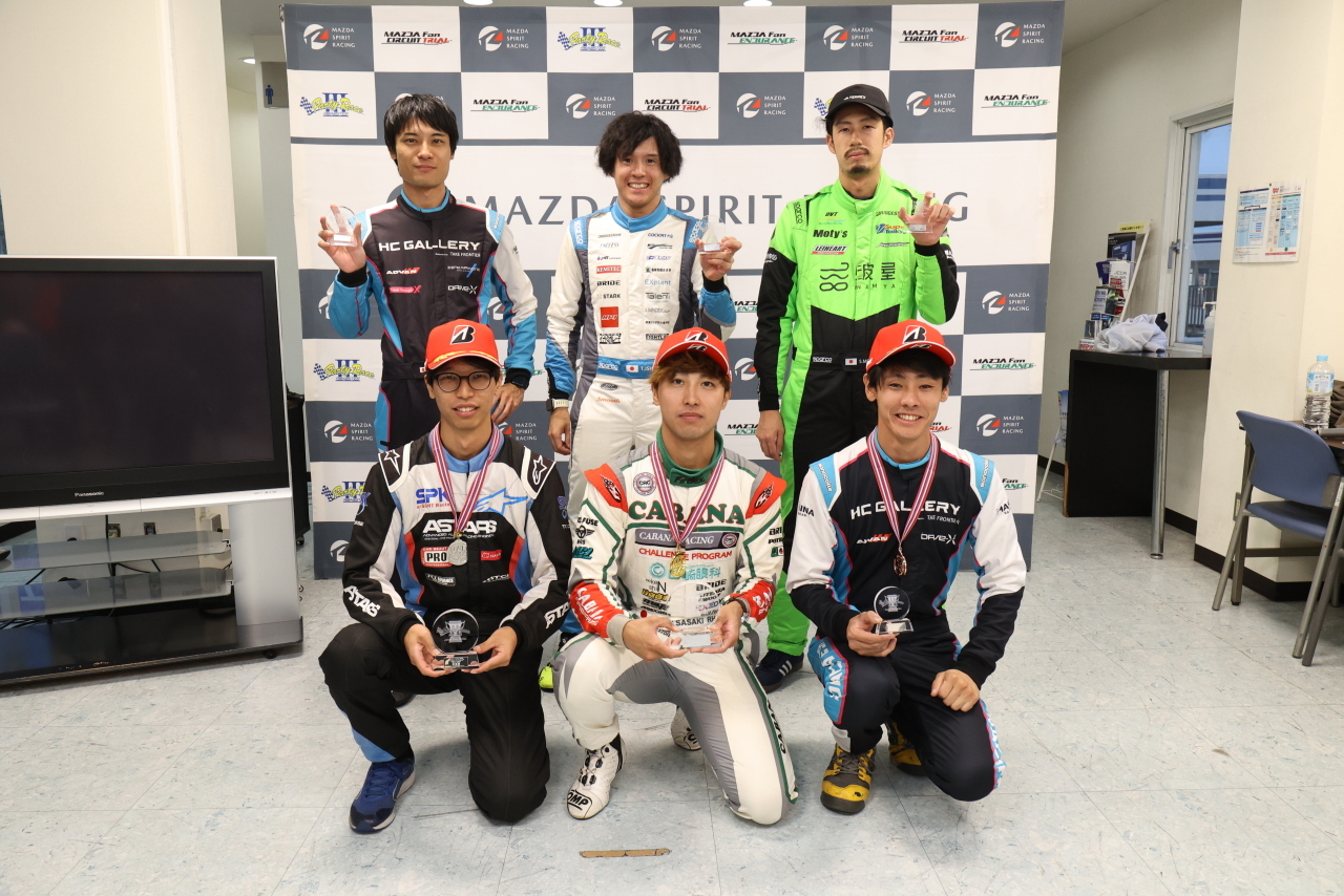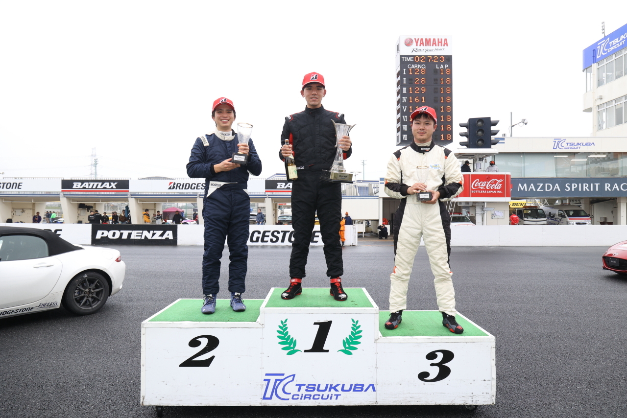 こちらも随所で見応えのあるバトルを展開された。ただレースとしては、128号車の普勝崚が2位以下の接近戦にも助けられて、独走でトップチェッカーを受けた。以下、2位の鷲尾拓未と3位の129号車の島崎徹がポディウムに登壇した。![]()
