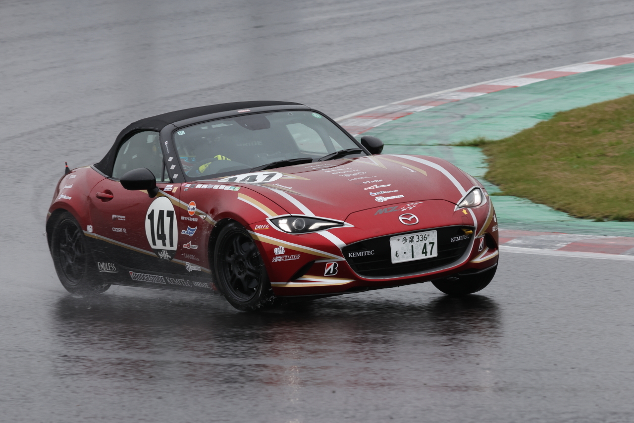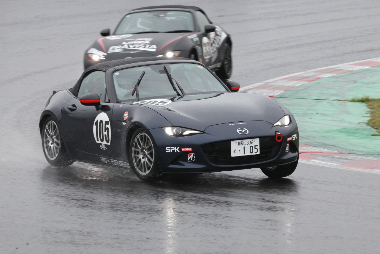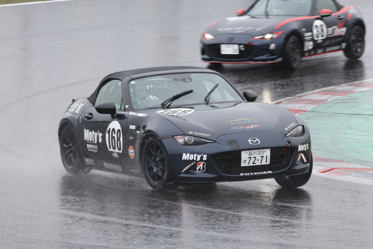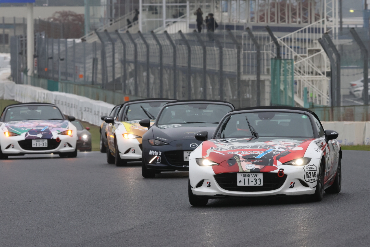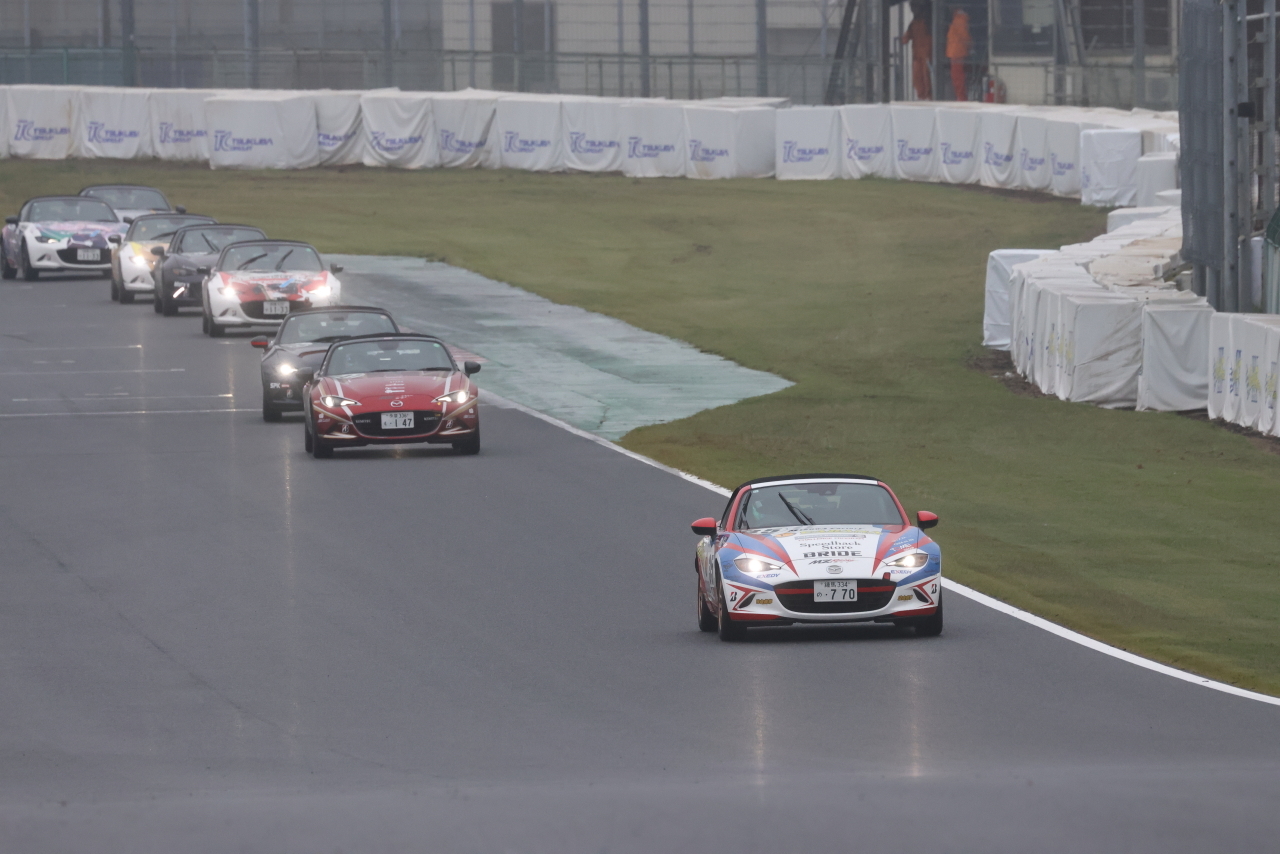 予選の後はNDクラブマンとNDシリーズのボーナスレースの決勝を間に挟んで、NDシリーズの決勝レースは13時58分から行われた。ジャパンツアーシリーズということでローリングスタートが採用され、周回数も18ラップとなる。直前には傘が要らないほど雨は弱まり、各ドライバーが内圧の設定に頭を悩ませたことだろう。