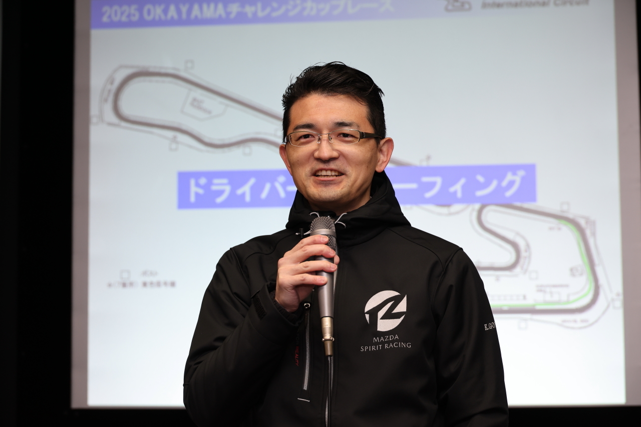 朝一番のブリーフィングではマツダのブランド体験推進本部ブランド体験ビジネス企画部モータースポーツ体験グループの後藤憲吾主幹が登壇。
