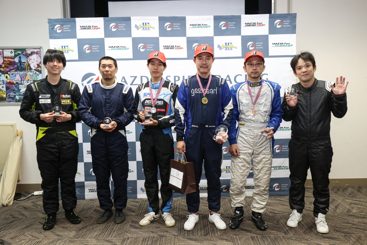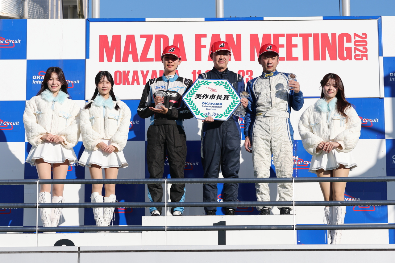 ただしクラブマンでは数多くの優勝経験を持つ的場だけに徐々にペースをアップ。3周目には市原をパスして2位に上がると、5周目には松田も抜き去って首位にカムバック。その後はジワジワとリードを広げて、トップでチェッカーフラッグを受けた。また中盤からは、松田と市原が時としてテールtoノーズの接近戦を演じた。ドラマが起きたのは8周目。ルーキーの市原が2番手に浮上して、そのまま逃げ切った。このトップ3台のバトルはいずれもクリーンでフェアなもので、チェッカー後もライバル同士が笑顔で握手を交わして健闘を讃えあっていた。![]()