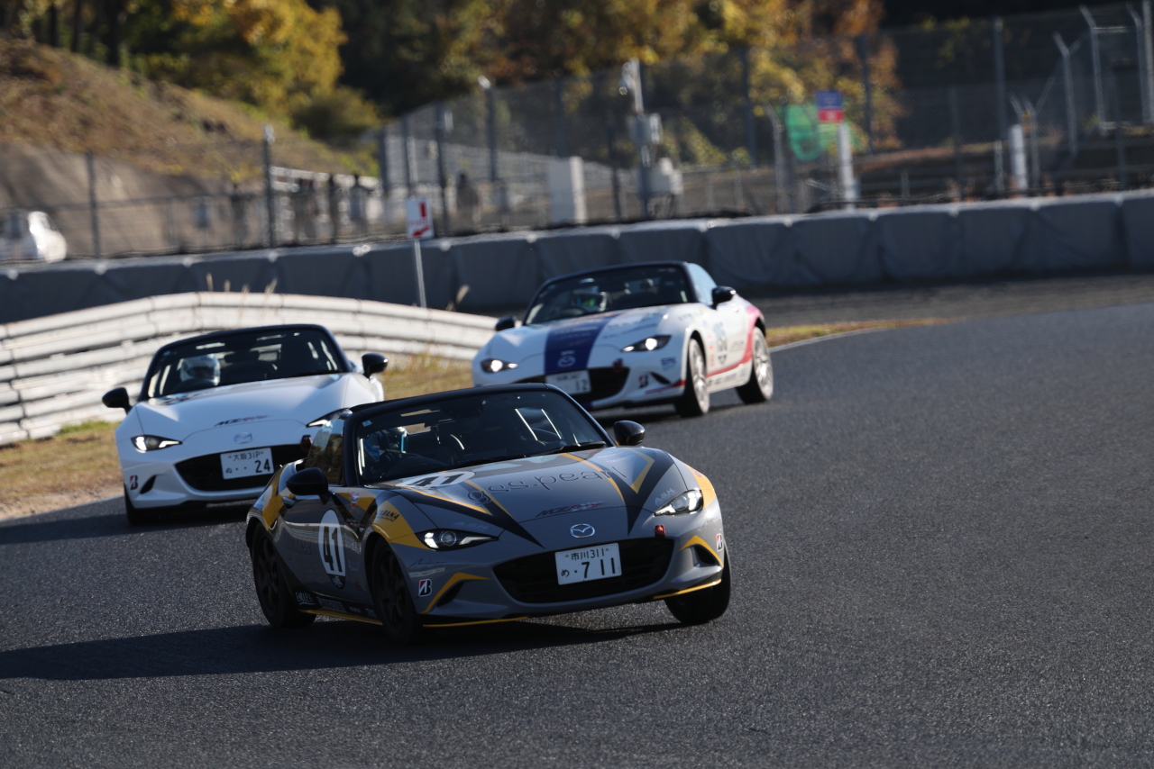 岡山国際サーキットにて11月22日、ロードスター・パーティレースⅢジャパンツアーシリーズの第6戦が開催された。エントリー12台のNDクラブマンクラスを制したのは41号車の的場雅仁。ベテランの技が光る逆転での勝利だった。なお本レースは9月28日のオートポリスが天候不良で順延されたのを受けての開催で、当日はこれに先立って同シリーズの第8戦と西日本シリーズ第4戦の決勝がダブルタイトルで行われる変則のダブルヘッダーだった。公式予選については、こちらから。